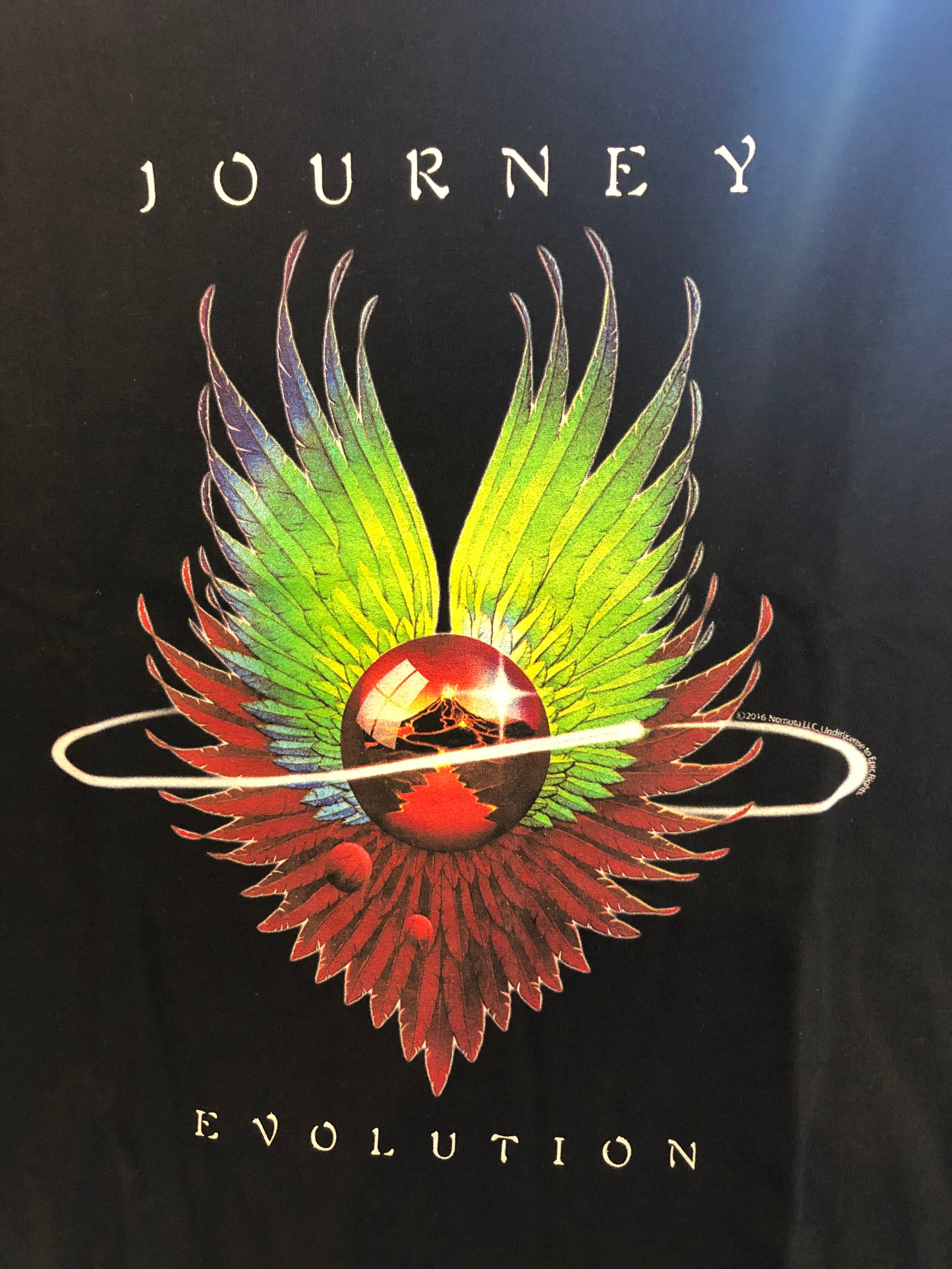 メンバーの交代や再結成、音楽性の変更などありながら今も活躍を続けるバンド“JOURNEY”の1979年リリースのアルバム「EVOLUTION(エボリューション)」のジャケットデザインを落とし込んだTシャツです。