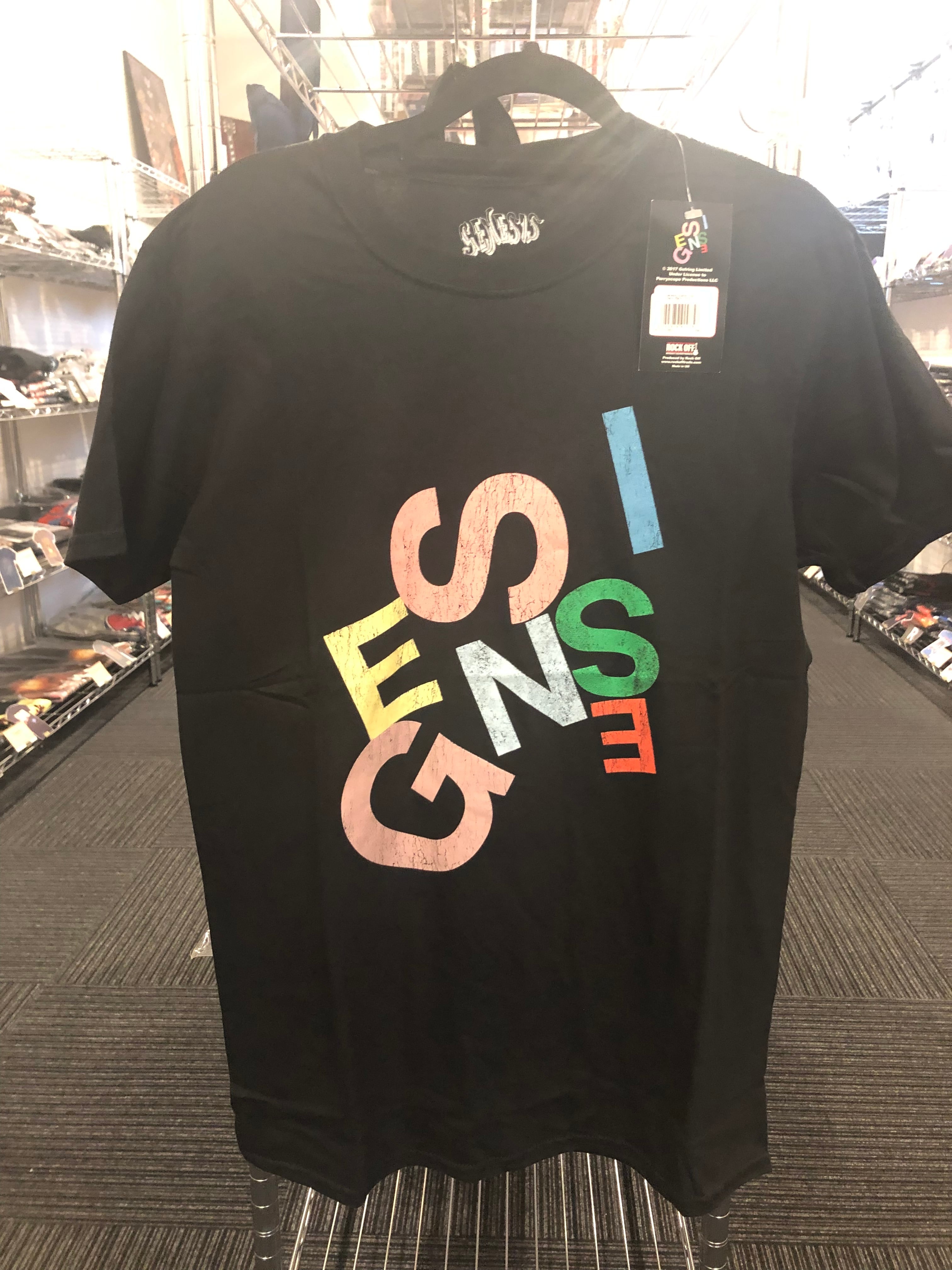 華やかなシアトリカル・サウンドからキャッチーなポップ・ロックまでと二面性を持つプログレッシブ・ロックバンド“ジェネシス”のカラフルなロゴをバラバラに散らして配置したデザインのTシャツ。